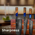 Bij Küchenkompane gebruiken we premium Damaststaal, inclusief VG10 en AUS-10 staal, bekend om uitzonderlijke scherpte, duurzaamheid en weerstand tegen roest en slijtage. Onze messen ondergaan een nauwkeurig hardingsproces om een hardheid van 60+ HRC te bereiken – dit garandeert langdurige scherpte en hoge prestaties.