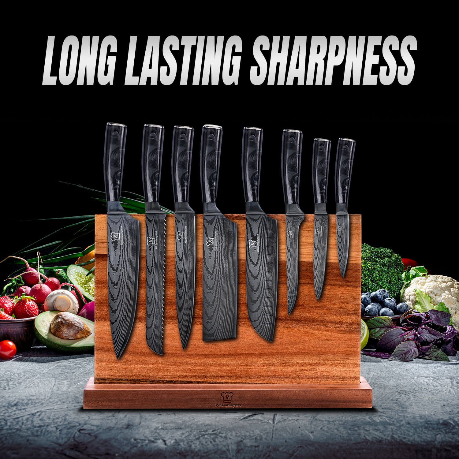 Dankzij het hoogwaardige staal en vakmanschap blijven onze messen veel langer scherp dan gewone messen. Bij regelmatig gebruik adviseren wij om ze elke 3–6 maanden met een Japanse slijpsteen te slijpen voor maximale prestaties.