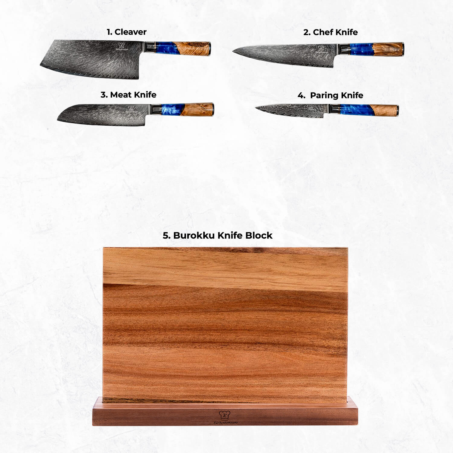 Bij Küchenkompane gebruiken we premium Damaststaal, inclusief VG10 en AUS-10 staal, bekend om uitzonderlijke scherpte, duurzaamheid en weerstand tegen roest en slijtage. Onze messen ondergaan een nauwkeurig hardingsproces om een hardheid van 60+ HRC te bereiken – dit garandeert langdurige scherpte en hoge prestaties.