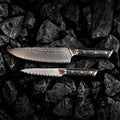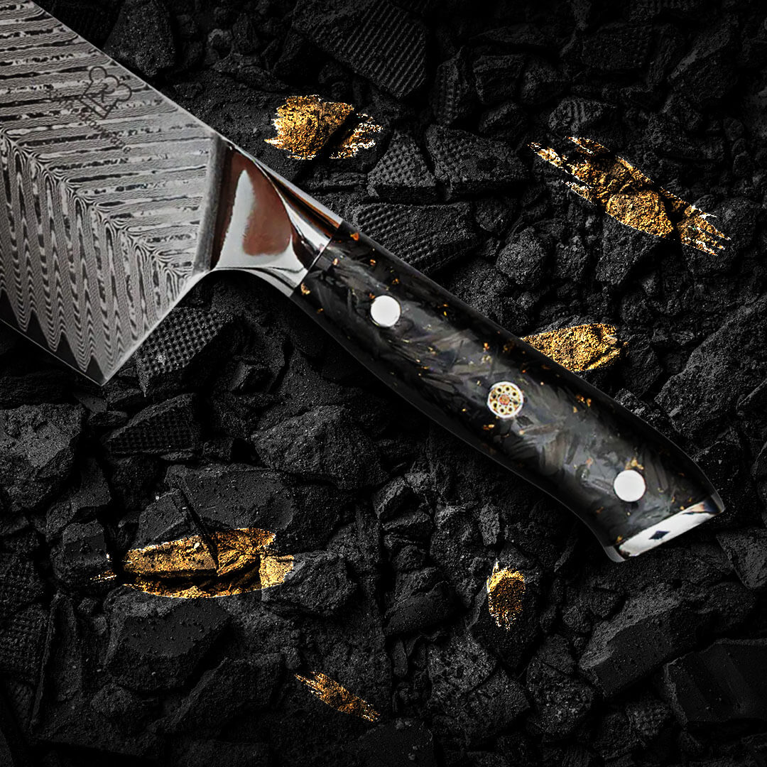 Bij Küchenkompane gebruiken we premium Damaststaal, inclusief VG10 en AUS-10 staal, bekend om uitzonderlijke scherpte, duurzaamheid en weerstand tegen roest en slijtage. Onze messen ondergaan een nauwkeurig hardingsproces om een hardheid van 60+ HRC te bereiken – dit garandeert langdurige scherpte en hoge prestaties.