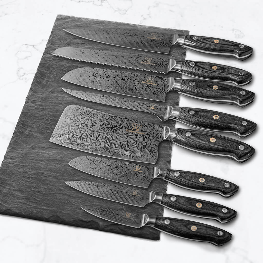 Bij Küchenkompane gebruiken we premium Damaststaal, inclusief VG10 en AUS-10 staal, bekend om uitzonderlijke scherpte, duurzaamheid en weerstand tegen roest en slijtage. Onze messen ondergaan een nauwkeurig hardingsproces om een hardheid van 60+ HRC te bereiken – dit garandeert langdurige scherpte en hoge prestaties.
