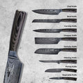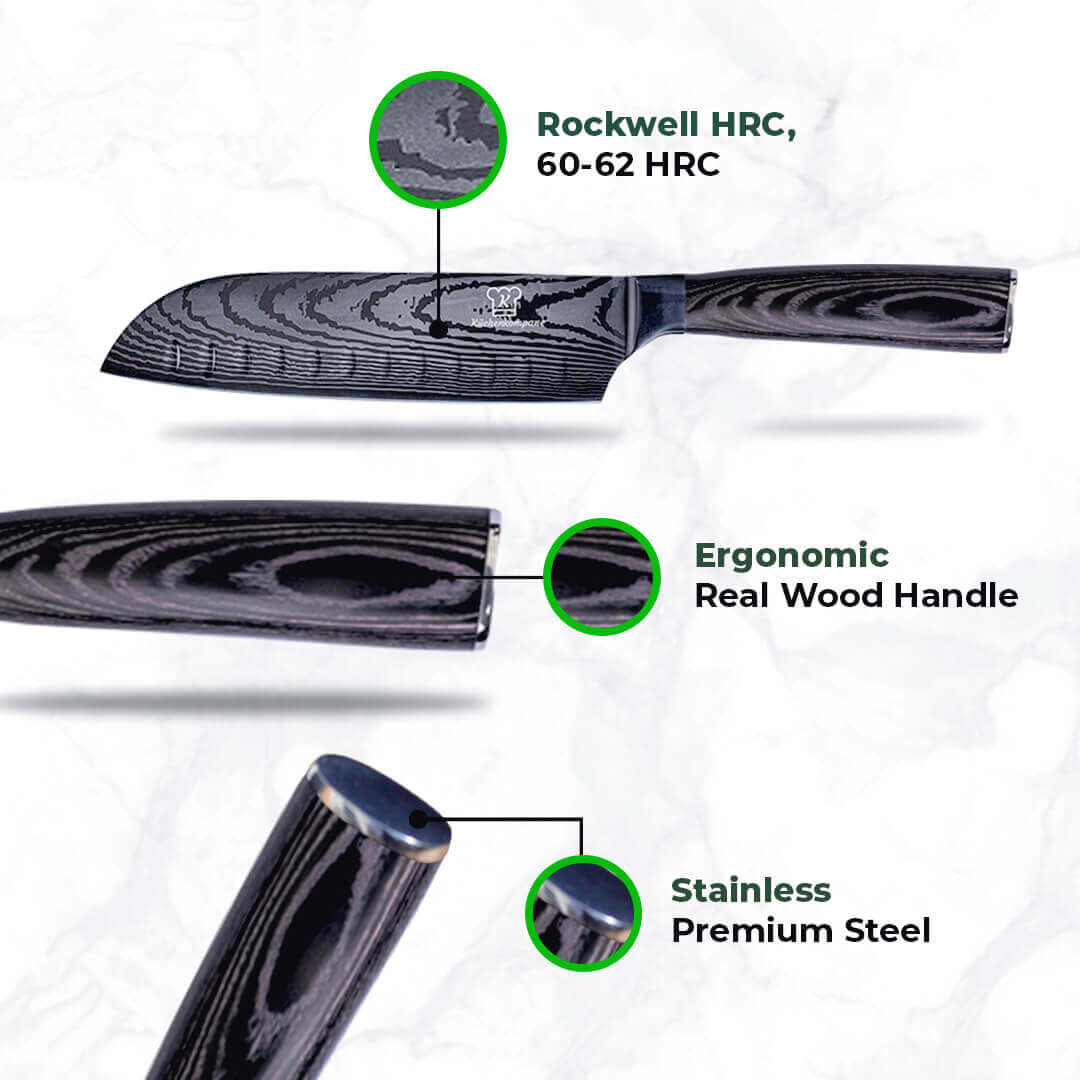 Bij Küchenkompane gebruiken we premium Damaststaal, inclusief VG10 en AUS-10 staal, bekend om uitzonderlijke scherpte, duurzaamheid en weerstand tegen roest en slijtage. Onze messen ondergaan een nauwkeurig hardingsproces om een hardheid van 60+ HRC te bereiken – dit garandeert langdurige scherpte en hoge prestaties.